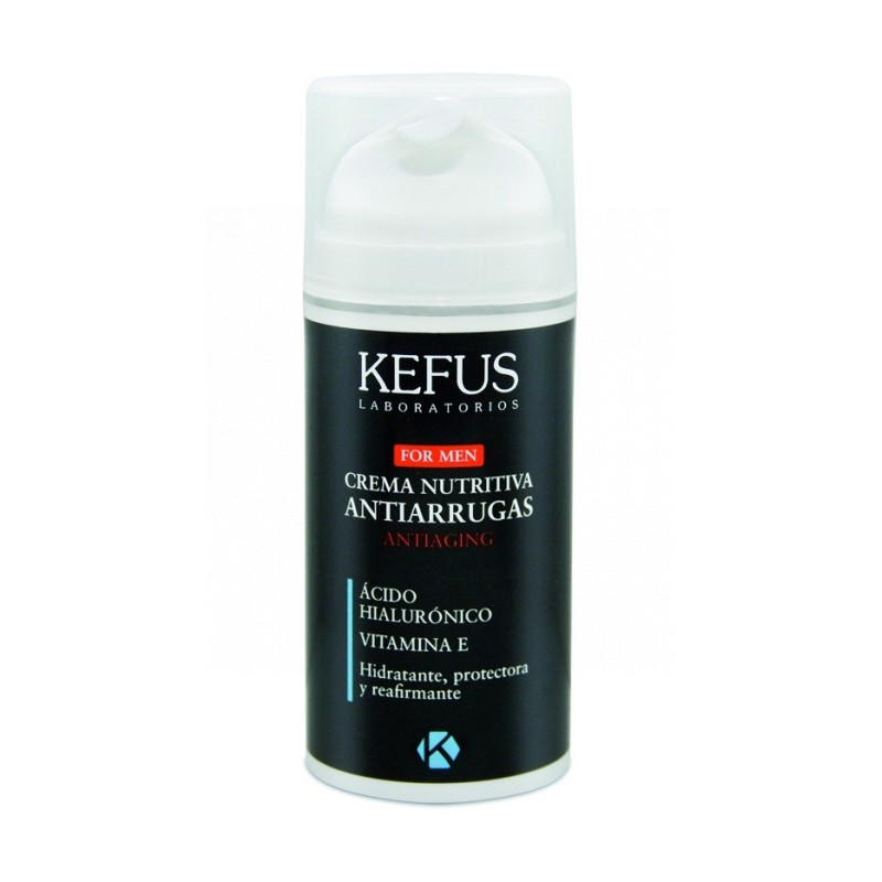 Crema Nutritiva con Acido Hialurónico for men Kefus para pieles secas con intensa acción antiarrugas de uso diario. Hidrata, reafirma y suaviza la piel. Después del afeitado nutre, corrige las irritaciones y elimina la sensación de sequedad y tirantez.