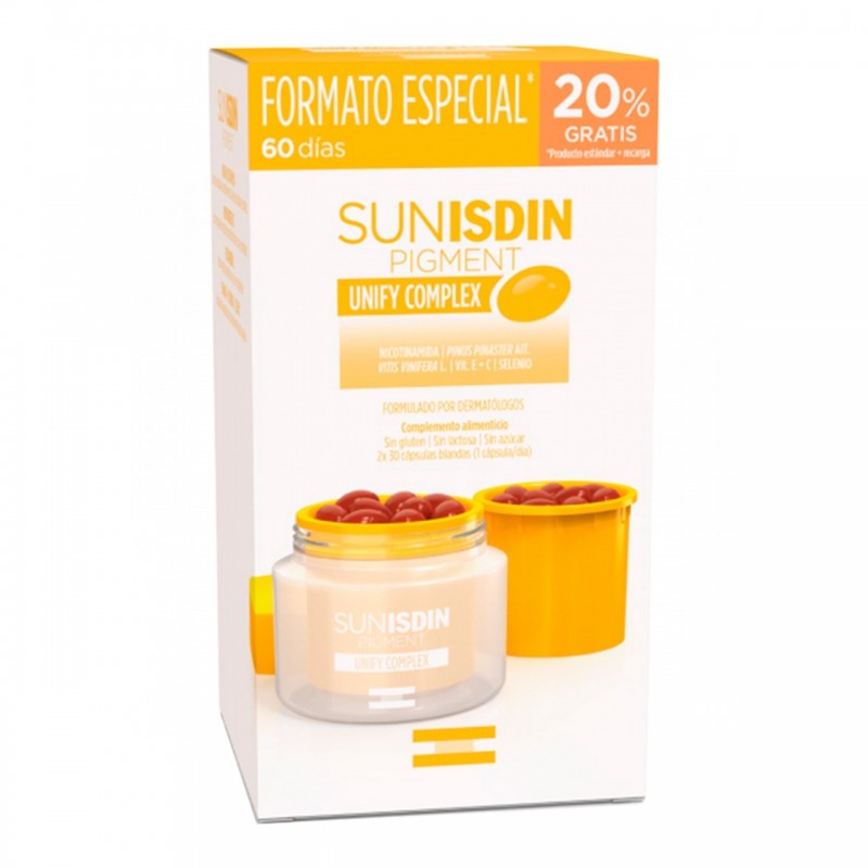 Complemento alimenticio para una protección antioxidante desde el interior. Cuida tu piel frente al daño solar y las manchas gracias a Unify Complex. Con vitaminas C y E, selenio y niacina para proteger las células y mantener la piel en buen estado. Para una piel uniforme y con un tono más claro.
