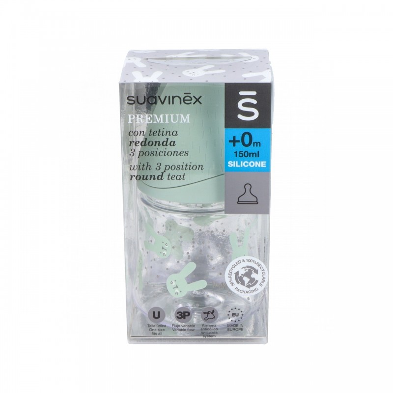 La tetina de Suavinex Biberón Premium Tetina 3 Posiciones está fabricada en silicona médica, material muy resistente. Además tiene una válvula anticólico para adaptarse a la succión del bebé durante la toma. Suavinex Biberón Premium Tetina 3 Posiciones tiene un flujo cariable: poco, medio y mucho.