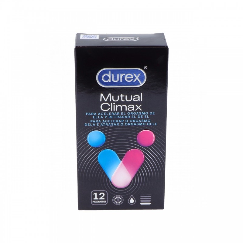 Durex Mutual Climax son preservativos diseñados con puntos y estrías para acelerar el clímax de ella y con lubricante Performa que contiene un 5% de benzocaína para retrasar el de él.