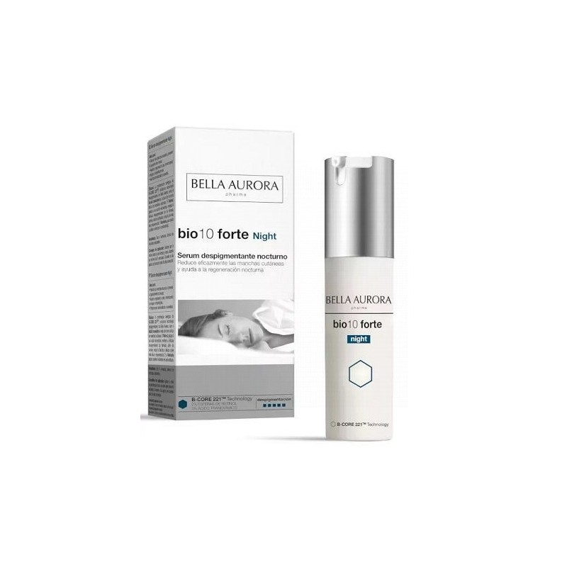 Bella Aurora Bio10 Forte Night es un tratamiento nocturno avanzado diseñado para reducir visiblemente las manchas oscuras y prevenir la aparición de nuevas. Su tecnología despigmentante B-CORE 221 actúa directamente sobre las células productoras de melanina, ofreciendo resultados eficaces. Además, potencia la regeneración nocturna de la piel, proporcionando luminosidad y suavidad al rostro, y minimizando arrugas e imperfecciones.
