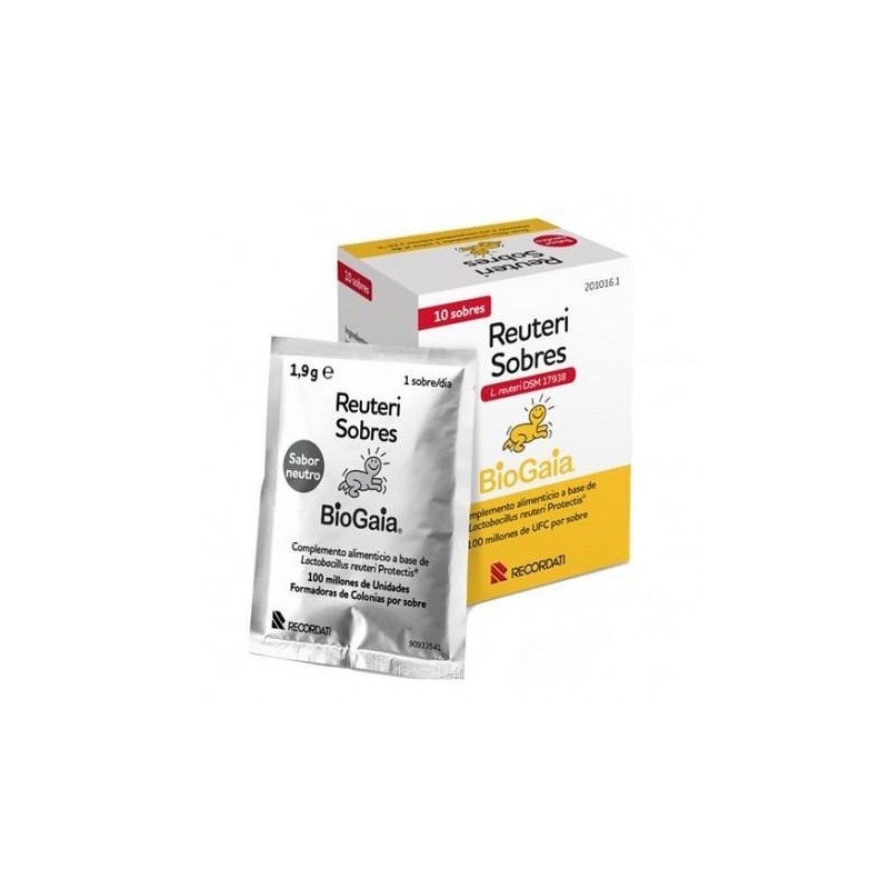 Sin gluten. Sin lactosa. Mantener fuera del alcance de los niños más pequeños. Formato: 10 sobres de 1,9 g - CN 201016.1 Peso neto: 19 g ℮ Modo de conservación: Conservar en lugar fresco y seco. Mantener a una temperatura inferior a 25 ˚C. Comercializado por: Casen Recordati, S. L. Autovía de Logroño, km. 13,300 50180 Utebo (Zaragoza – España) Producto bajo licencia de BioGaia. Protegido por patente EP2040723.